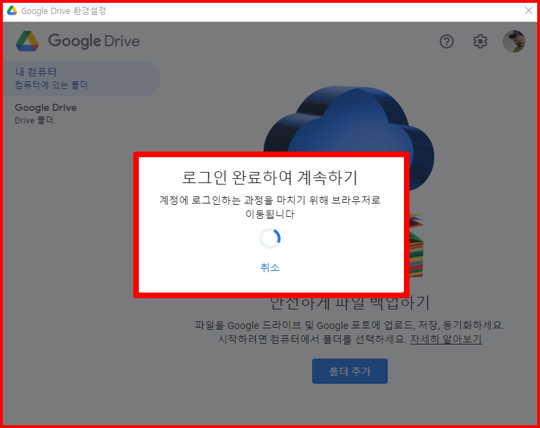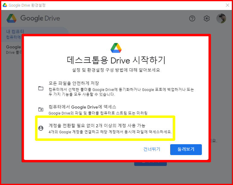 구글 드라이브 데스크톱용 환경 설정에서 프로필을 선택합니다.
