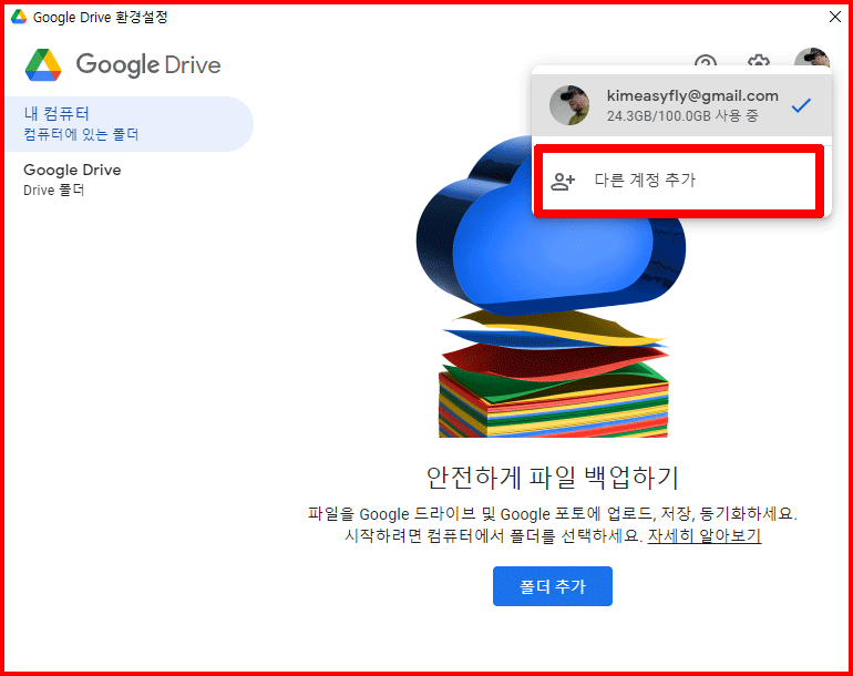 '다른 계정 추가'가 튀어 나옵니다. 지금 사용 중인 15GB말고 다른 계정의 공간을 추가한다는 얘기. 아래 이미지의 100GB는 제가 추가 구입해 사용중인 공간입니다. 추가 구입 없이 기본만 사용하는 형님의 경우는 15GB로 나올겁니다.