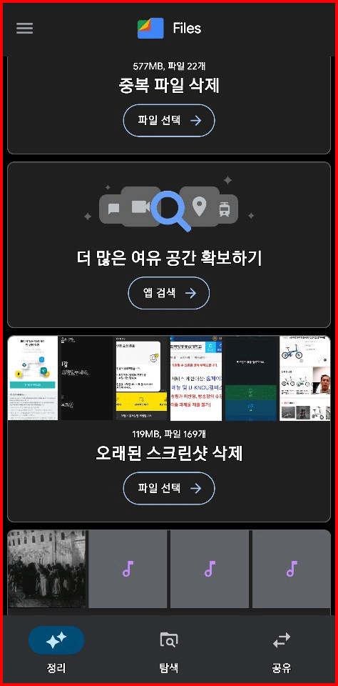 구글 'Files'는 '중복 파일 삭제' 외에도 '오래된 스크린샷' 또는 '희미한 이미지'등을 골라내서 삭제를 통해 내부 공간을 청소해 줍니다.