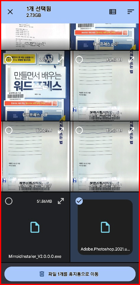 다음 이미지는 2.73GB나 되는 큰 파일을 지울거냐고 묻고 있습니다. 어마어마하게 큰 파일이 있는 것은 제가 리눅스 설치 중에 받아둔 리눅스 설치 파일인 것 같아요. 폰에는 전혀 쓸모없는 파일이 숨어있어 내장메모리를 차지하고 있으면 스마트폰 성능도 떨어집니다. 이런 파일을 '콕' 찍어 골라냅니다.