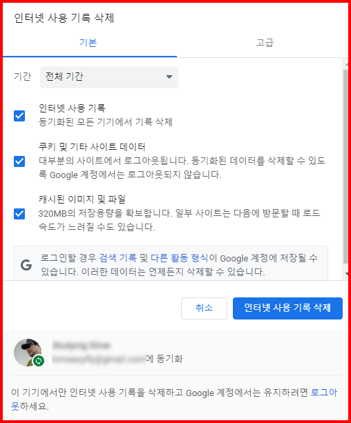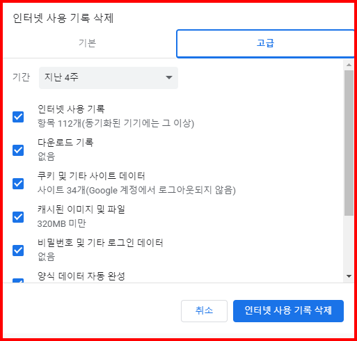 이 방법은 방문기록에서 '인터넷 사용 기록 삭제'를 선택합니다. 여기에는 '기본'과 '고급'의 두 방법이 있습니다.