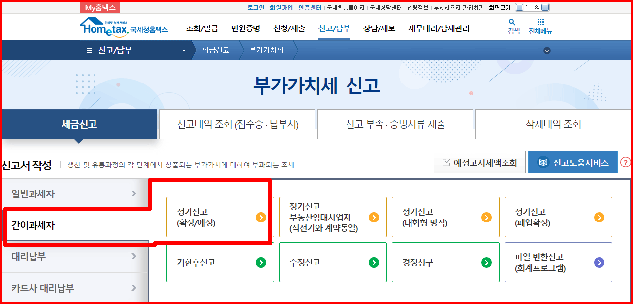 홈택스 '신고/납부'를 선택하여 '부가가치세 신고'를 선택합니다.