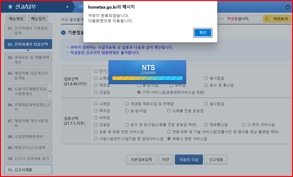 '저장 후 다음이동'을 클릭하여, 다음 단계로 이동합니다. 업종을 선택합니다. 박장로님은 '부동산 중개업'을 하시기 때문에 '부동산 관련 서비스업'을 선택했습니다.