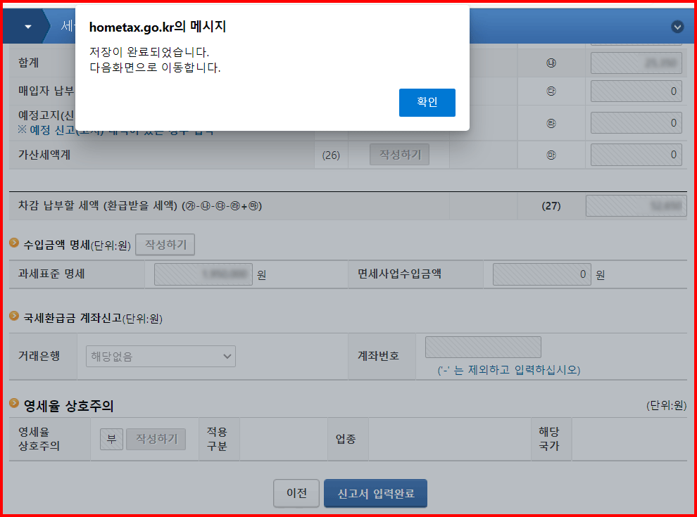 위와 같은 과정을 통해 작성된 내용은 저장이 되고 국세청 프로그램에 의해 자동 계산됩니다. '신고서 입력완료' 버튼을 클릭하여 완성합니다.