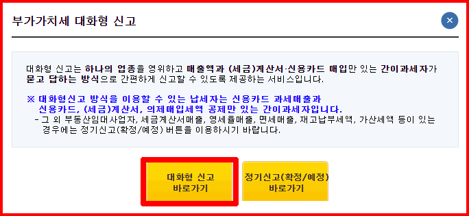 그중 '간이과세자'를 선택합니다. 간이과세자는 일 년에 한 번 신고합니다. '정기신고'를 선택하고, '대화형' 신고를 선택합니다.