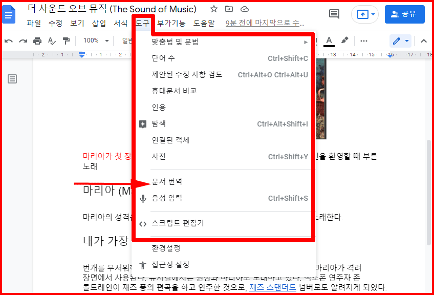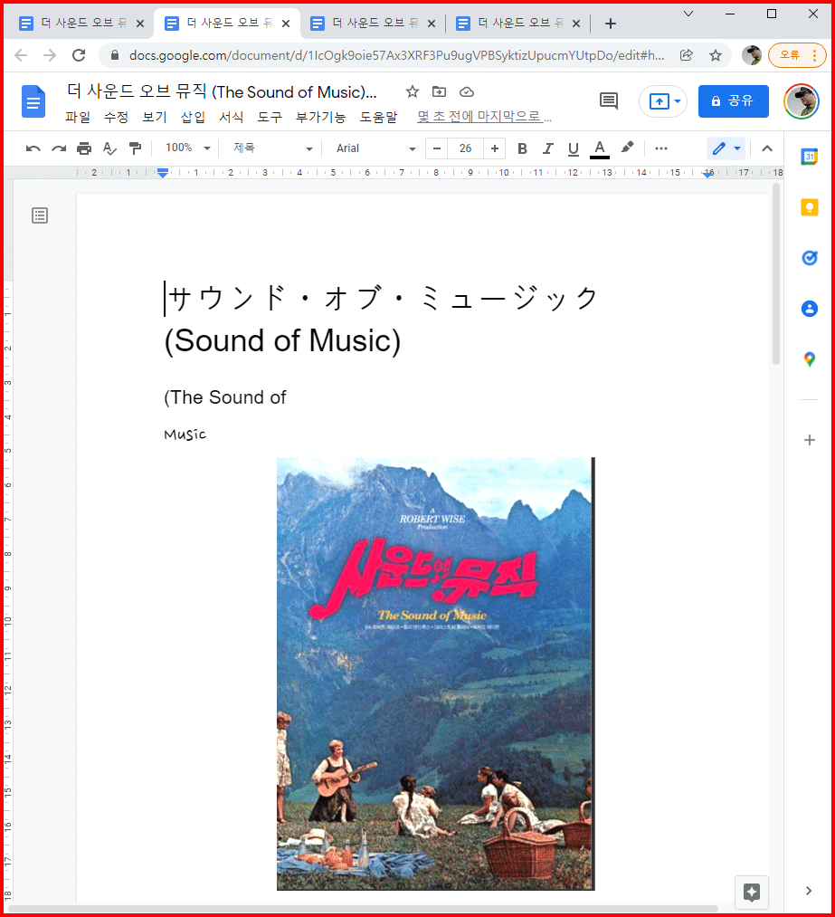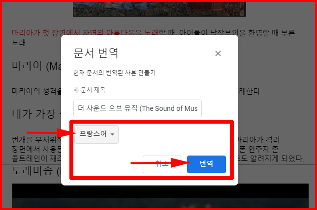 구글 문서에서 제공하는 문서 번역 기능을 이용하면 다양한 외국어로 번역이 가능합니다. 지금 작성 중인 '사운드 오브 뮤직'에 관한 구글 문서를 영어, 프랑스어, 그리고 일본어로 번역해 보겠습니다.