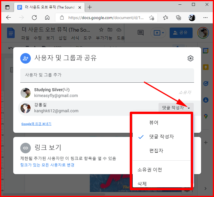 [공유] 버튼을 누르면 공유 현황을 볼 수 있습니다. 지금은 강홍길 선배님과 이 문서를 공유하고 있습니다. 강홍길 선생님은 이 문서에 '댓글 작성자'로 참여하시게 되어 있네요. '댓글 작성자' 옆의 아래삼각 표시를 클릭하면 다른 권한들을 볼 수 있습니다. 이곳에서 권한을 변경할 수 있습니다.