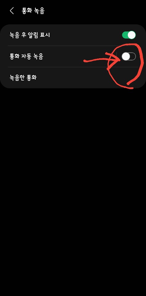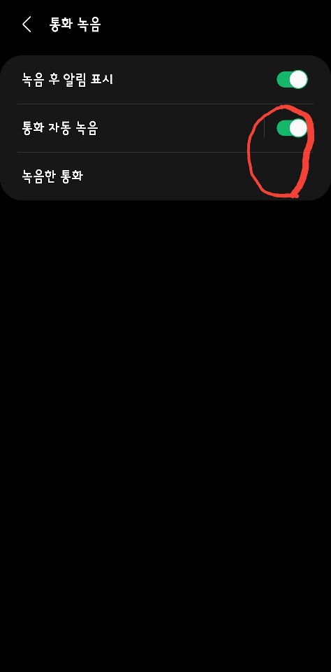 '통화 녹음' 메뉴에는 '녹음 후 알림 표시'와 '통화 자동 녹음'이 있습니다. 일반적으로 '통화 자동 녹음'은 비활성화되어 있습니다. 이것을 선택하여 초록색이 나오도록 하면 됩니다.