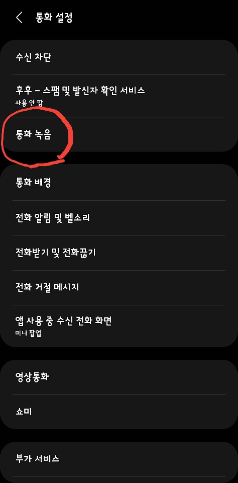 '설정'을 선택하면 통화에 관한 여러 설정 메뉴가 나옵니다. 그중에서 '통화 녹음'을 선택합니다.