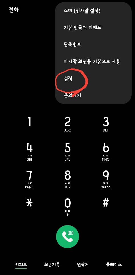 전화 어플에서 설정을 들어갑니다. 설정을 들어가기 위해서는 우상단에 [세 점 더보기]가 있습니다. 이것을 선택하면 다음과 같은 메뉴들이 보입니다. 아래 이미지는 삼성폰의 경우인데, LG폰은 약간 다를 수 있습니다.