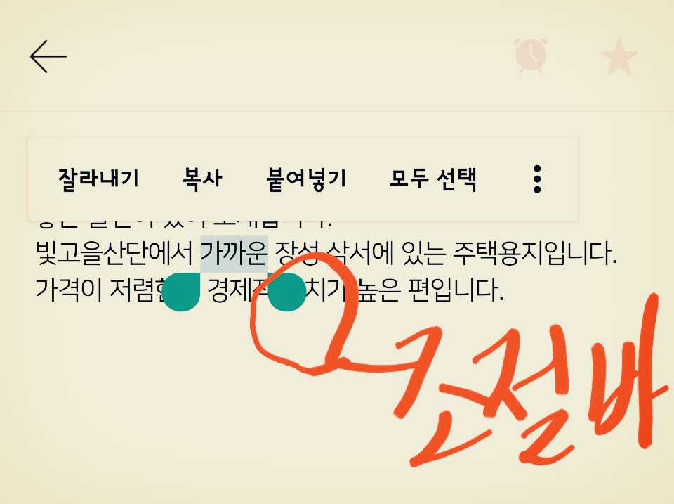 아래 글에서 어떤 단어도 상관없습니다. '가까운'이란 단어를 두 번 터치했습니다. 선택된 단어 좌우로 조절바가 나옵니다.