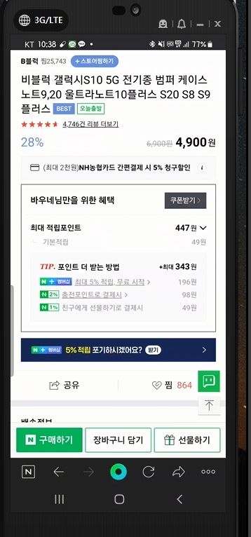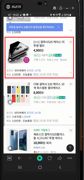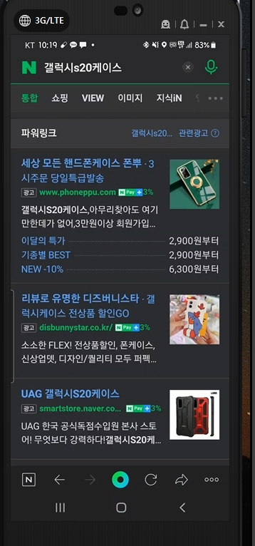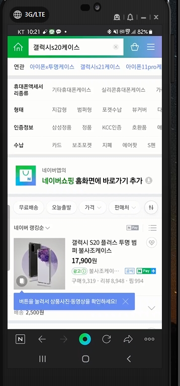[갤럭시s20케이스]를 검색해 보겠습니다. 여러가지 정보가 나옵니다. 그 가운데 쇼핑과 관련된 정보를 얻기 위해 위 메뉴 중 [쇼핑]을 선택합니다.