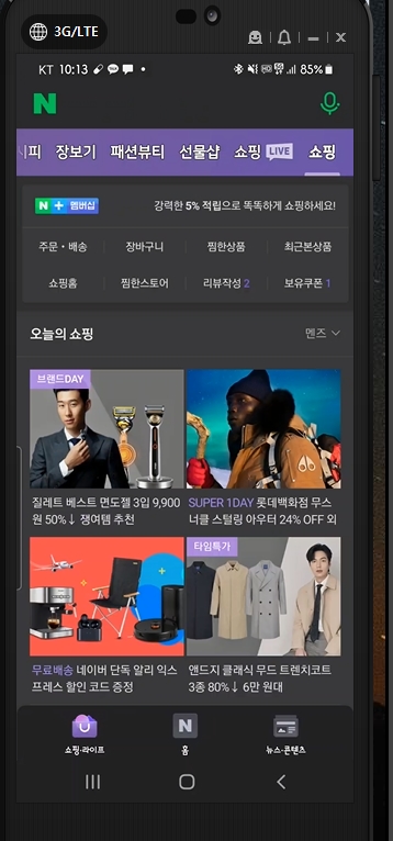 쇼핑라이프를 선택합니다. 쇼핑에 특화된 메뉴입니다. 물론 여기서 네이버정보를 검색할 수도 있습니다. 그린닷 또는 네이버홈을 선택하면 네이버초기화면을 만나게 됩니다.