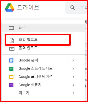폰으로 찍은 이미지 파일을 구글 드라이브에 업로드합니다. 웹브라우저의 '구글드라이브(drive.google.com)'에서 [새로 만들기] 버튼을 선택합니다. 구글 드라이브에는 파일을 올릴 수도 있고 폴더를 함께 올릴 수도 있습니다. 여기서는 위 파일만 올립니다.