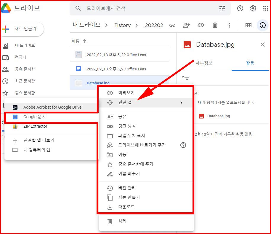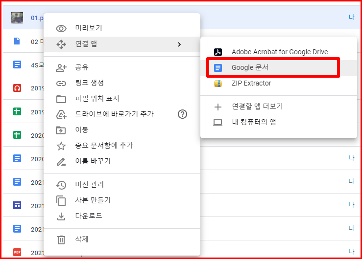 이미지 파일이 업로드되면, 해당 파일을 마우스 오른쪽 버튼을 클릭한 다음 나타난 팝업 메뉴에서 [연결 앱> 구글 문서]를 선택합니다.