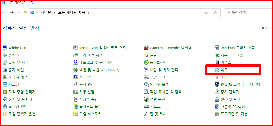 제어판에서 '복구'를 선택합니다. 시스템 파일을 백업하면 PC를 시작할 수 없더라도 문제를 해결할 수 있습니다.