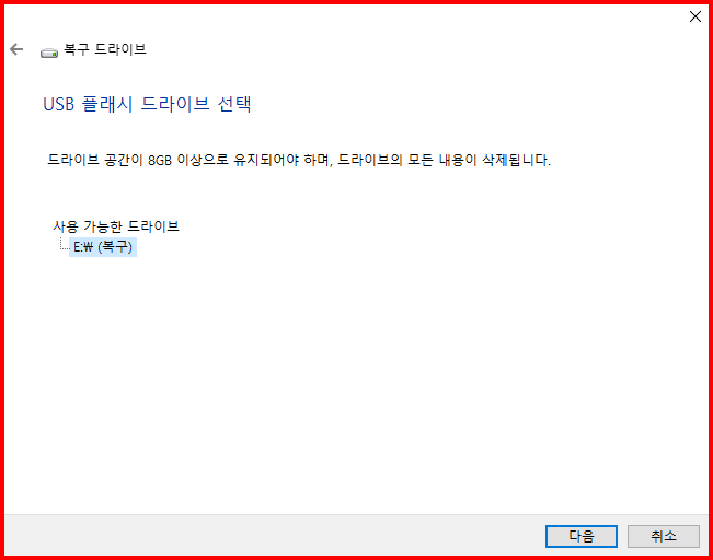아래 경우처럼 '8GB 이상을 요구'하는 경우도 있지만, 복구 내용이 많으면 '16GB 이상을 요구'하기도 합니다. 드라이브 안에 있는 모든 항목은 삭제되고 복구드라이브는 만들어 집니다. 개인 파일이 있으면 미리 백업을 해야 합니다.