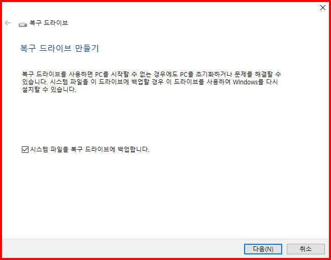 '시스템 파일을 복구 드라이브에 백업'을 체크하고 복구 드라이브를 만듭니다. 윈도를 다시 설치할 수 있도록.