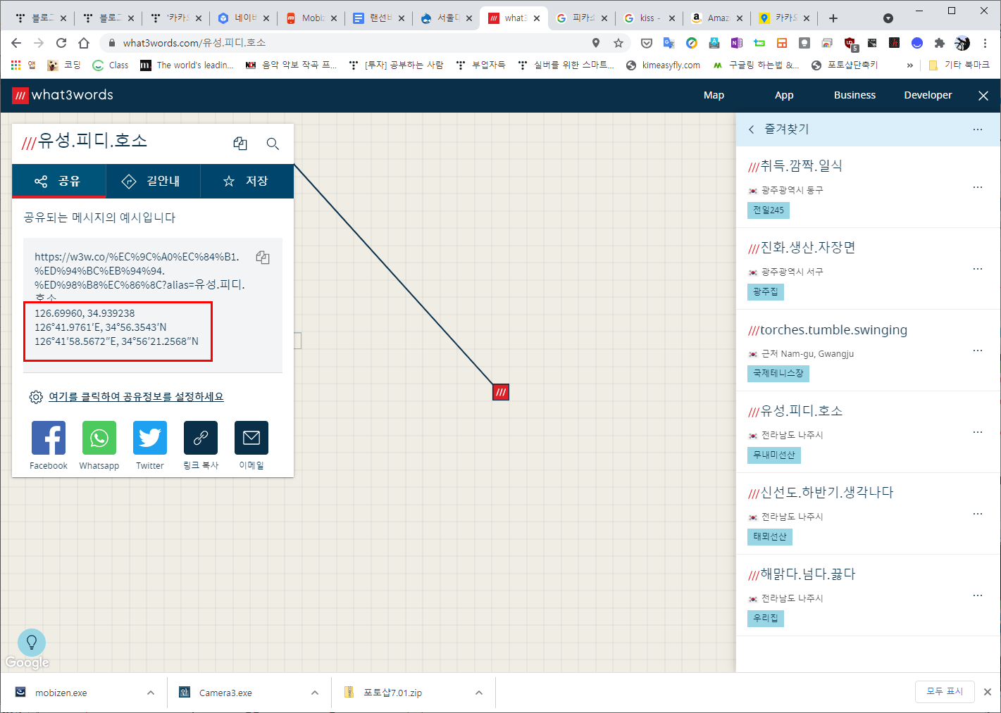 아래는 카카오맵을 이용하여 찾은 저의 선산 정보입니다. 선산 정보 외에도 산이나 바다에서 조난을 당했을 때 조난 위치를 이것을 이용하여 파악해 조난구조센터에 알리면 더 신속한 도움을 받을 수 있겠더군요. 또는 외국에 가서 어떤 위치를 찾아갈 때도 유익할 것이구요. 예를 들어 외국 어떤 기관을 찾아간다 합시다. 자동차를 운전해 간다면 그 기관 건물보다는 주차장이 더 중요하지요. 아니, 주차장의 입구 위치 정보가 필요하지요. 주차장의 위치 좌표값이나 what3words 주소를 알면 훨씬 유익하지 싶어요.