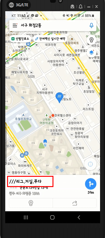 팝업된 창에서 [W3W]를 선택합니다. 그러면 그 장소의 W3W 주소, 즉 what3words 주소가 아래에 표시됩니다. 이번에는 [리그.거실.푸다]라고 나왔네요. 별다른 의미가 있는 단어는 아닙니다. 그저 공식에 의해 만들어낸 단어의 조합이지요.