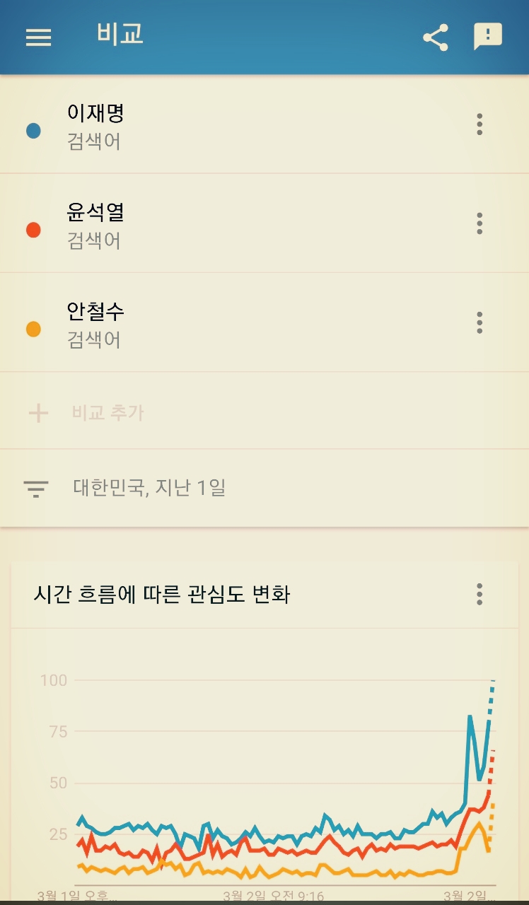 2022년 3월 2일 20시부터 22시까지 열띤 토론이 있었다. 토론이 끝난 순간 1일간의 구글 트렌드를 비교했다.