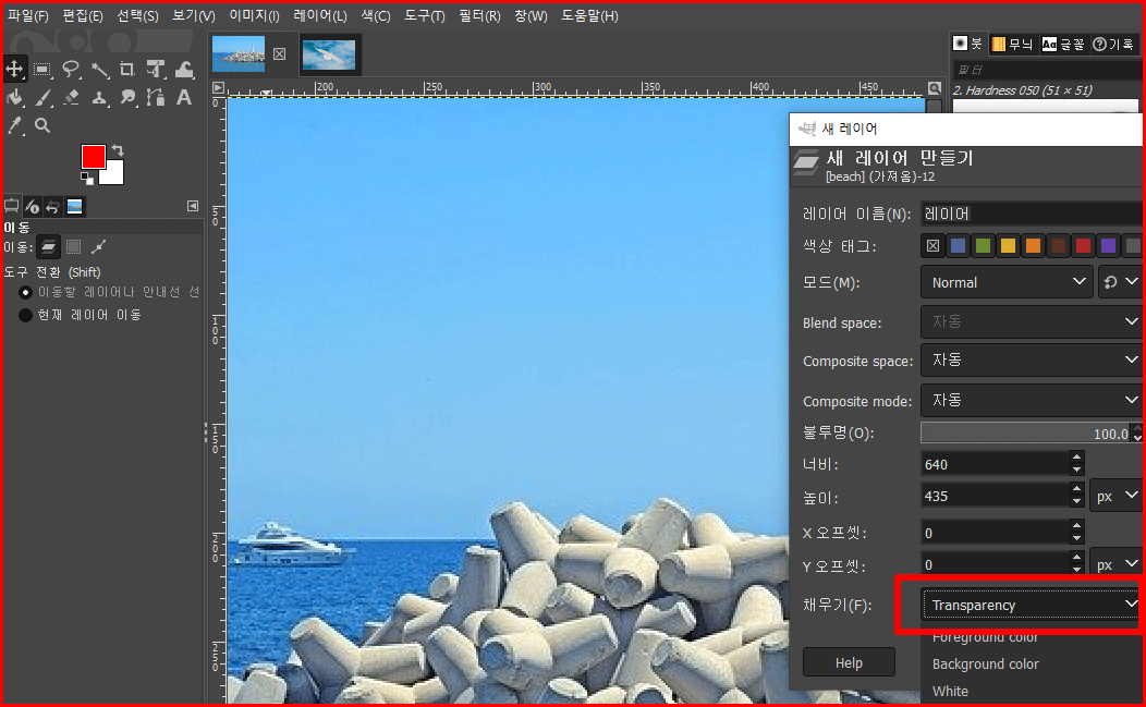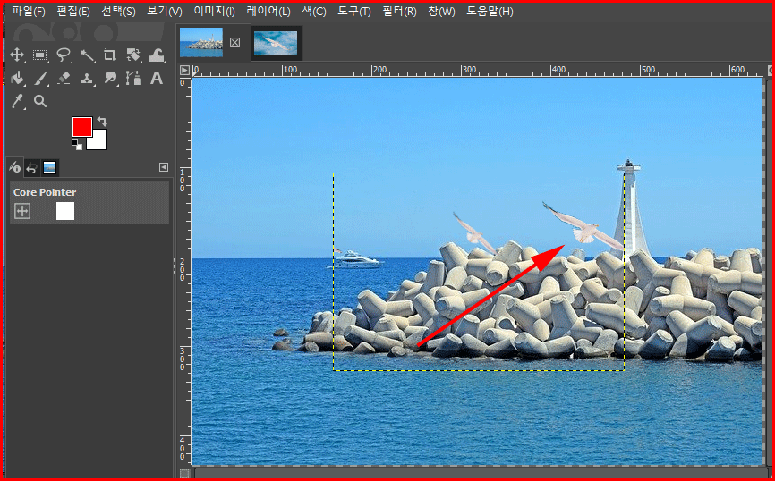 김프를 실행합니다. 다운로드 한 방파제 사진을 먼저 불러 옵니다.
