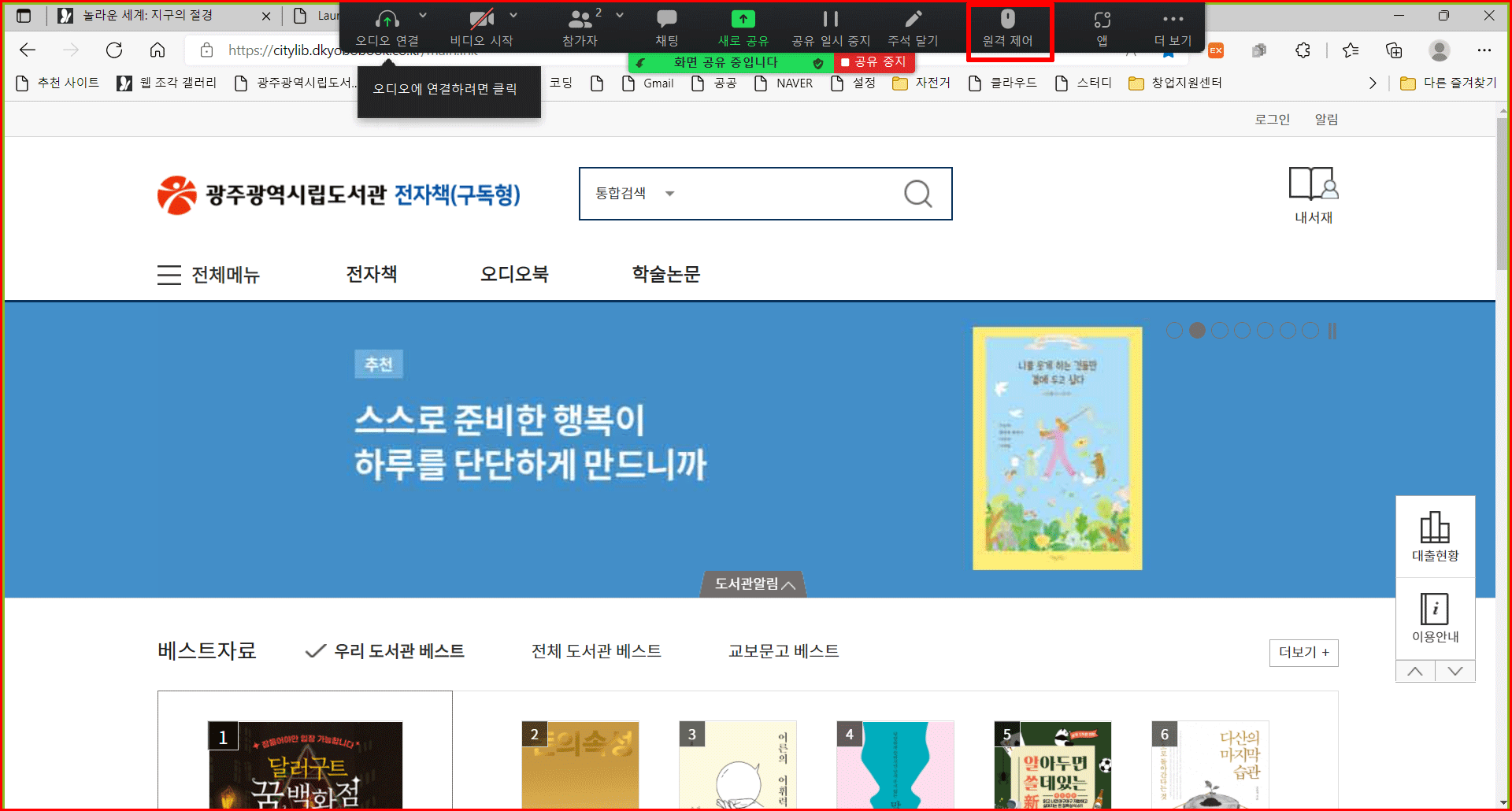 공유 화면 위에 있는 여러 메뉴 중에 [원격 제어]라는 메뉴가 있습니다. 이곳에서 [모든 요청 자동 수락]을 선택합니다. 물론 특정인을 지정할 수도 있는데, 여기서는 멘토와 멘티의 두 사람의 화상 학습을 전제로 진행하겠습니다.