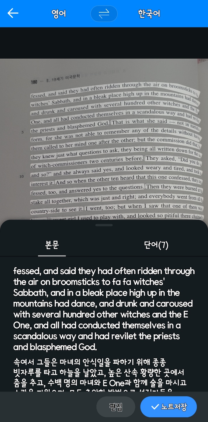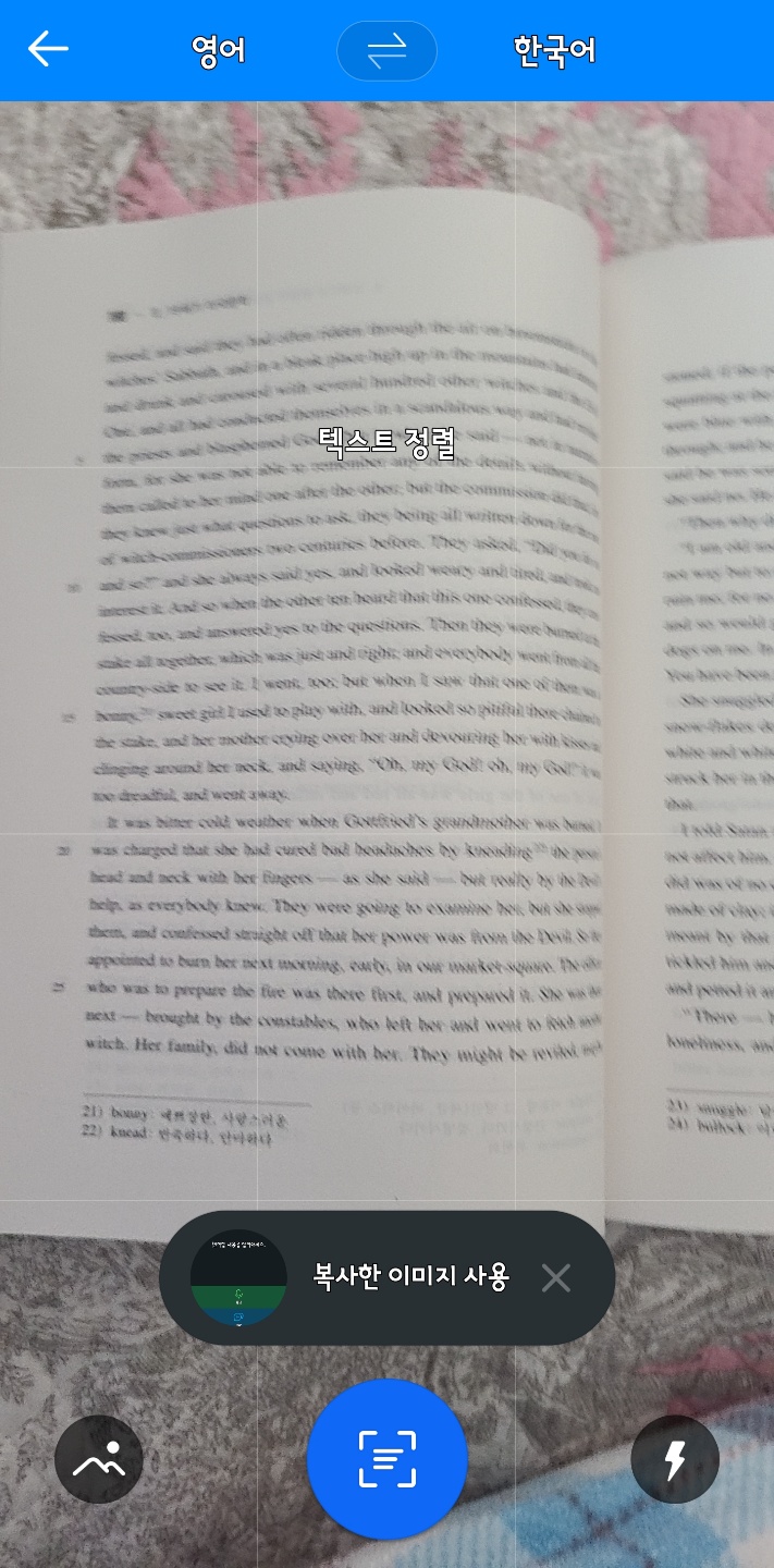영어 텍스트에 들이 댑니다. 대상을 스캔하면서 글자를 인식합니다.
