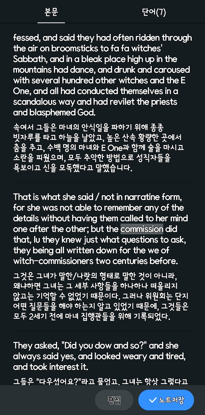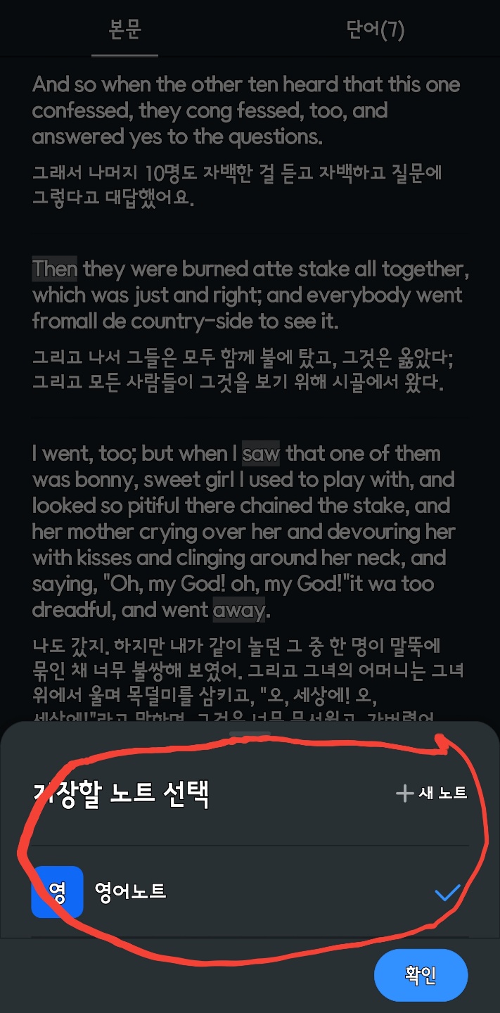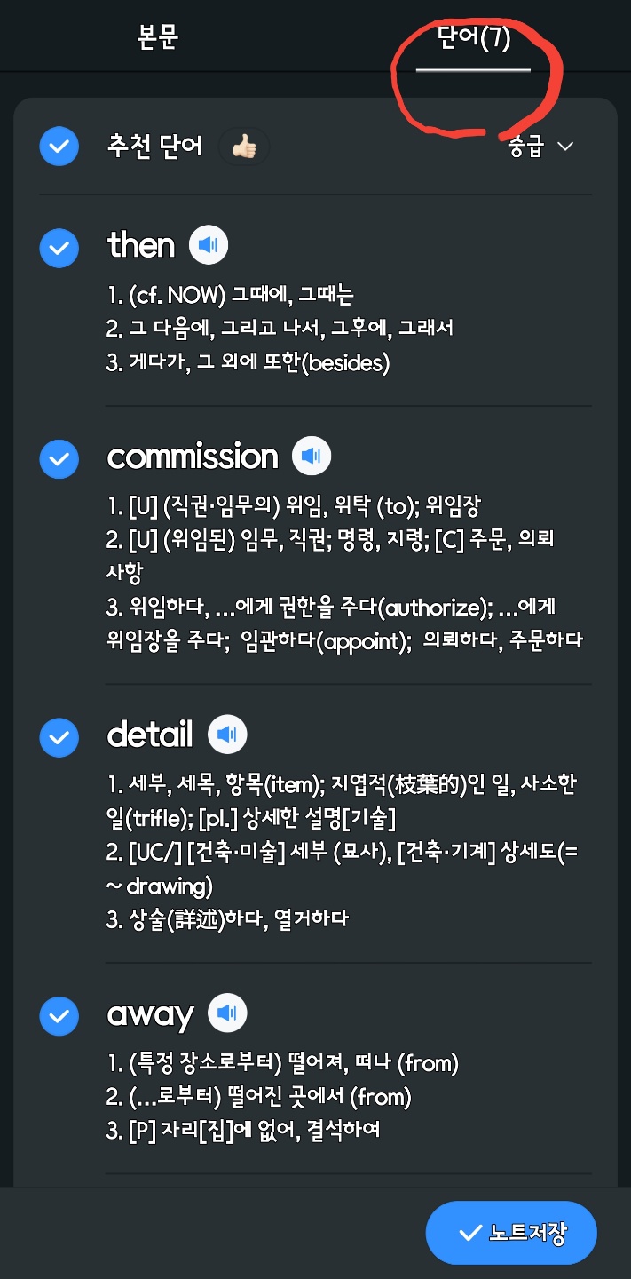 단어나 문장을 자신의 노트에 보관할 수 있는 기능도 있군요. 노트에 저장해두면 복습에 도움되겠네요.