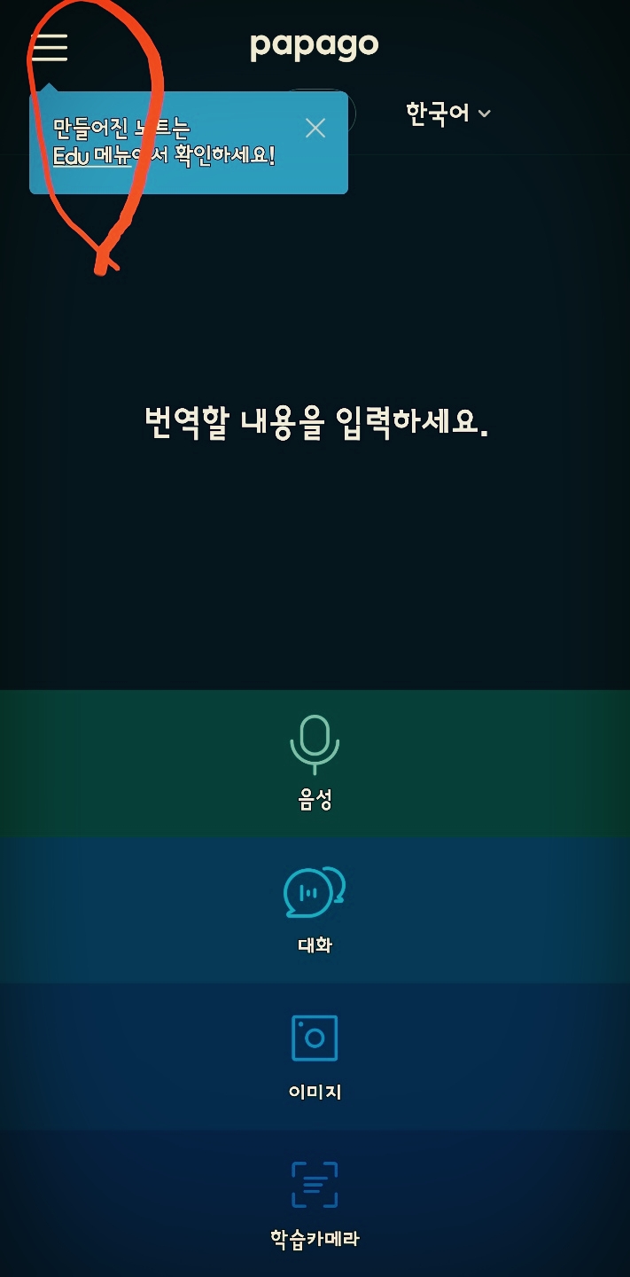 우선 모바일 파파고를 엽니다. 왼쪽 위에 있는 '세줄 더보기'를 선택하세요.