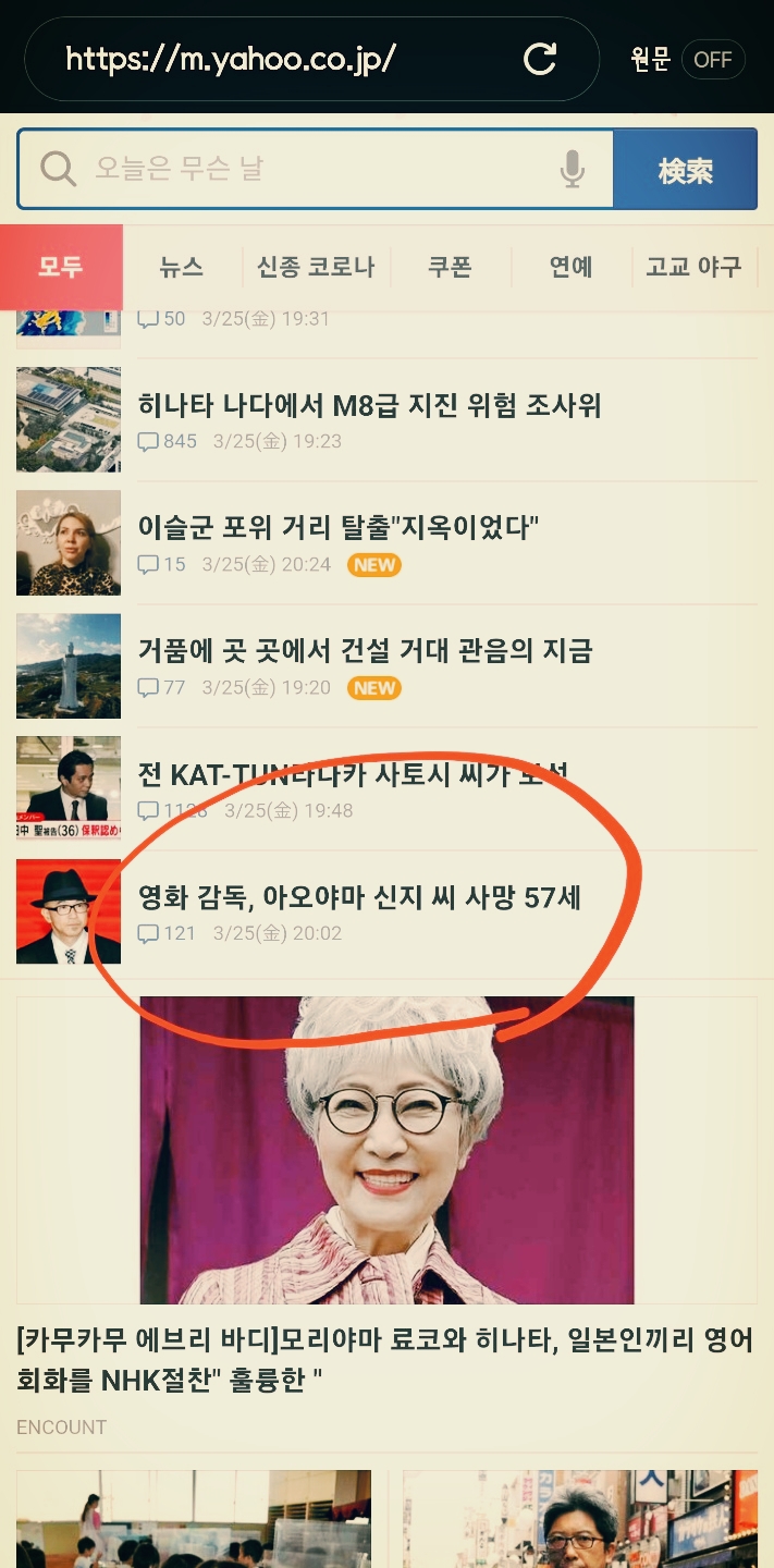 아래는 위 일본판 야후가 한글로 번역된 페이지입니다. '영화 감독, 야오야마 신지씨...'라는 기사가 완벽하게 번역된 결과를 볼 수 있네요. 한글과 어순이 비슷한 일본어는 번역이 더욱 정확합니다.