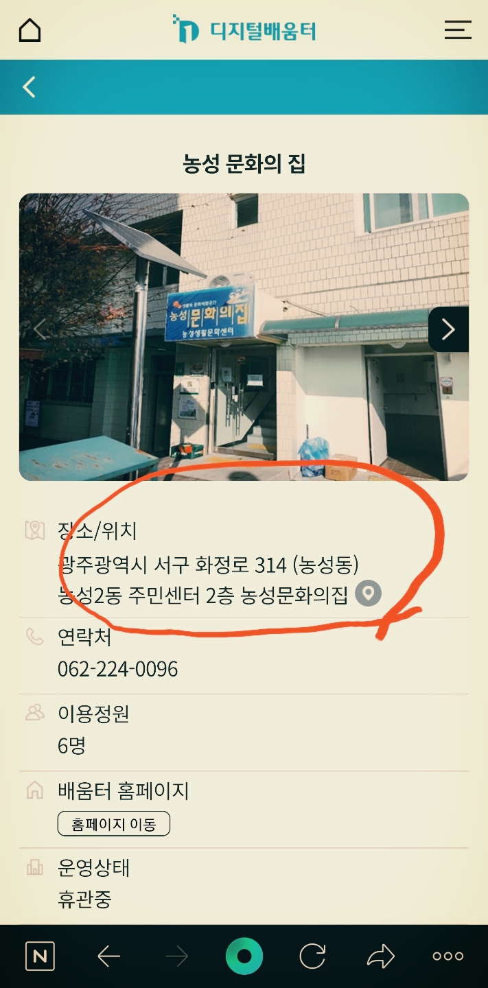 지역에서도 각 구별 배움터를 지정할 수 있습니다. 다음은 '광주광역시 서구'를 선택한 결과입니다. 그 가운데서 '농성 문화의 집'을 선택했습니다. 지금은 교육 시작 전이라 '휴관중'이지만 교육이 시작되는대로 교육이 가능하다고 변경될 것입니다.