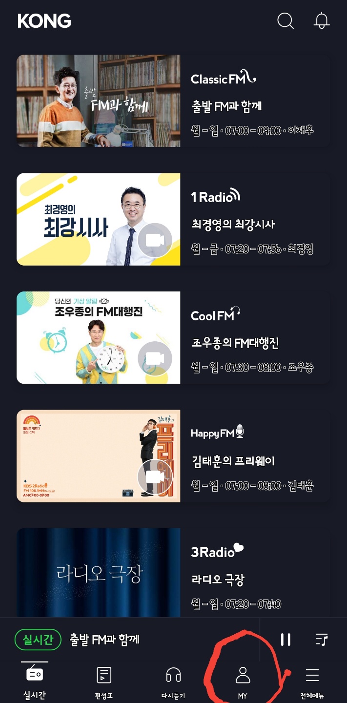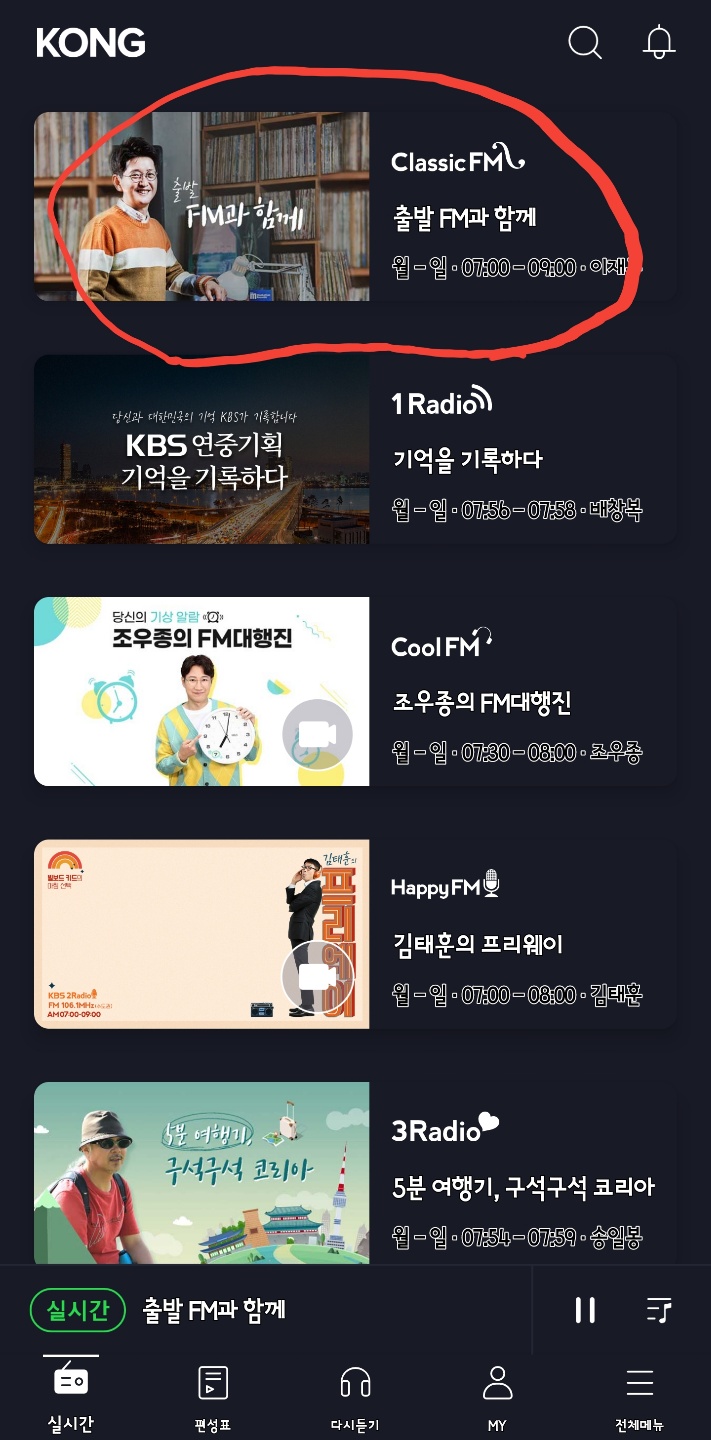 KBS KONG은 KBS에서 제공하는 라디오 어플입니다. 어플이란 어플리케이션 준말입니다. 라디오 프로그램 중에 클래식을 보내주는 방송이 'Classic FM'입니다. 이 방송을 들으면서 취침할 수도 있고, 아침 기상 알람을 설정할 수 있습니다.