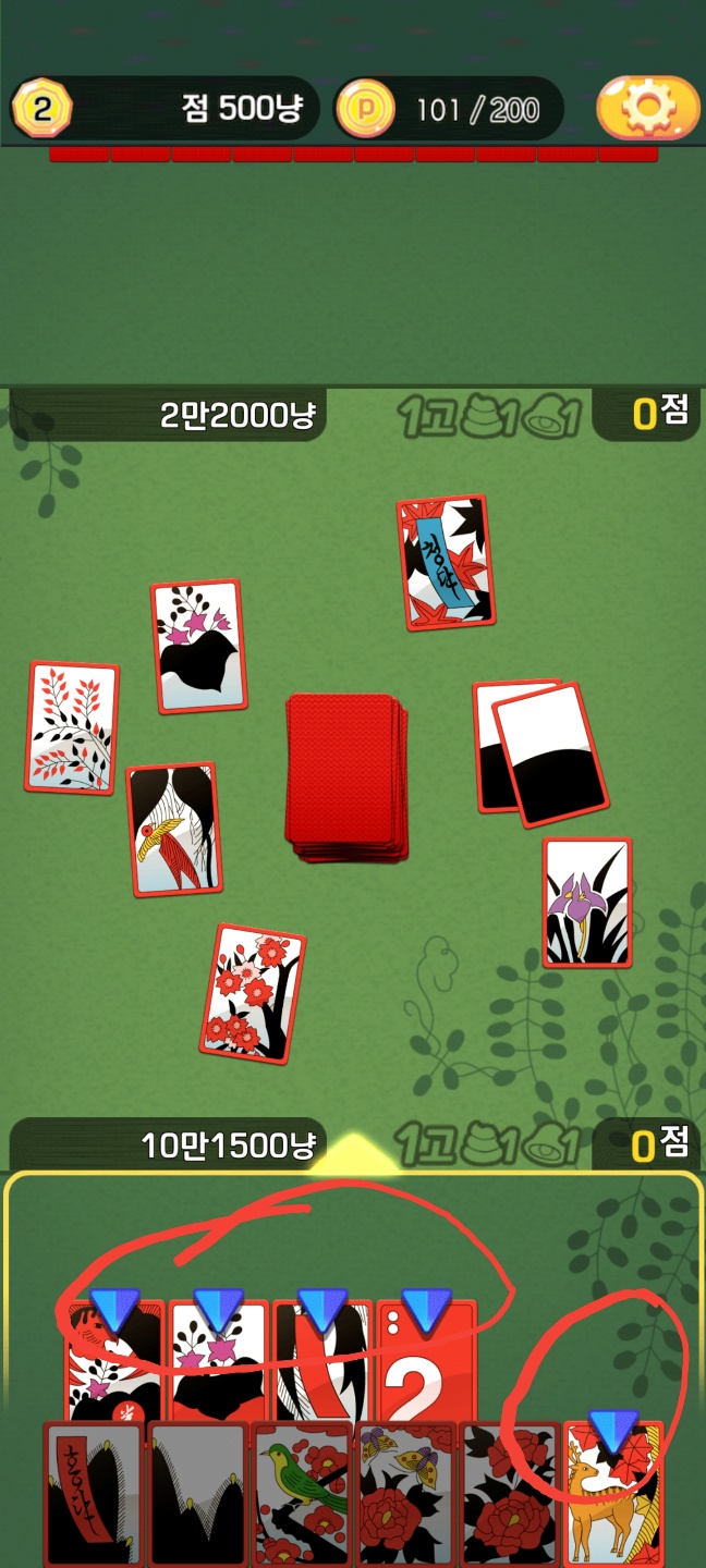 게임 상대는 스마트폰입니다. AI라고 할까요. 녀석도 아주 시끄러운 녀석입니다. 친절하게도 바닥에 맞출 패가 있으면 내 표에 표식을 달아줍니다. 파란색 아래 화살표로.