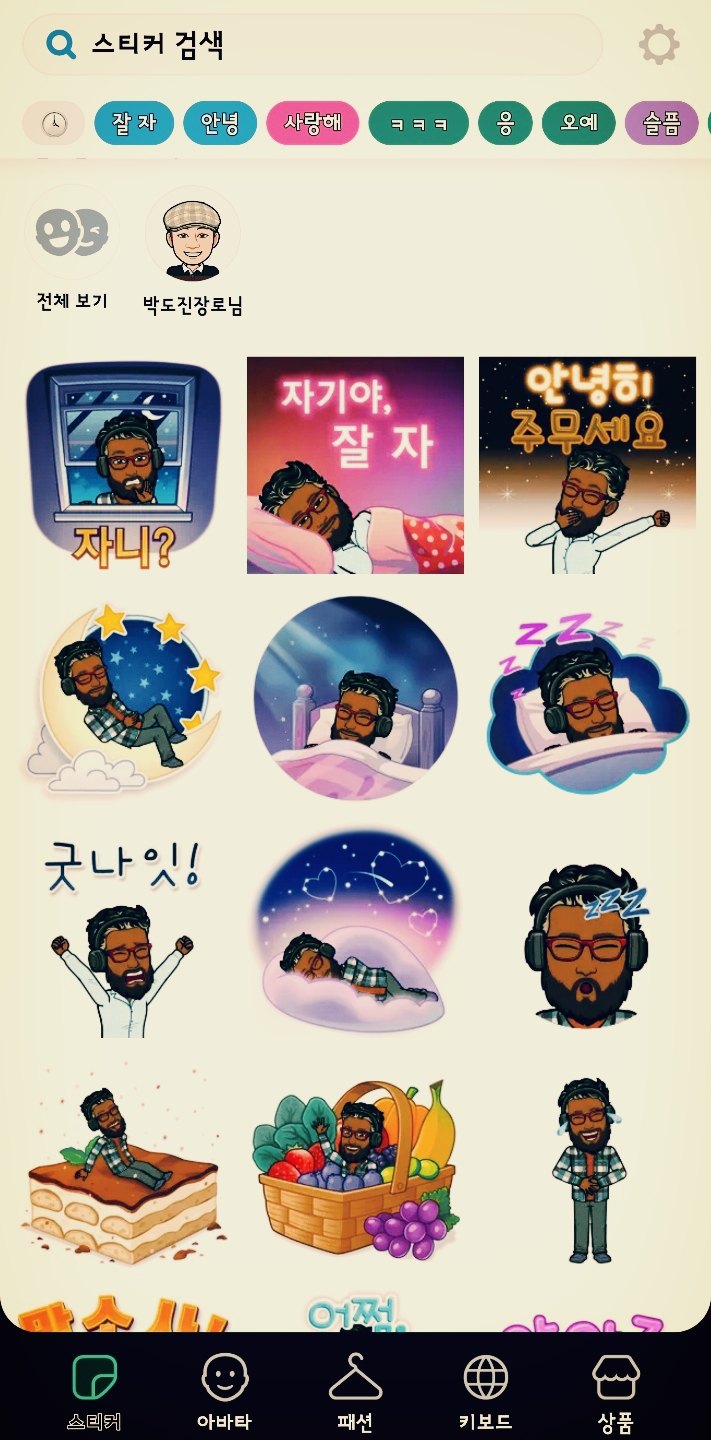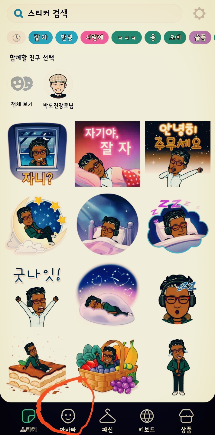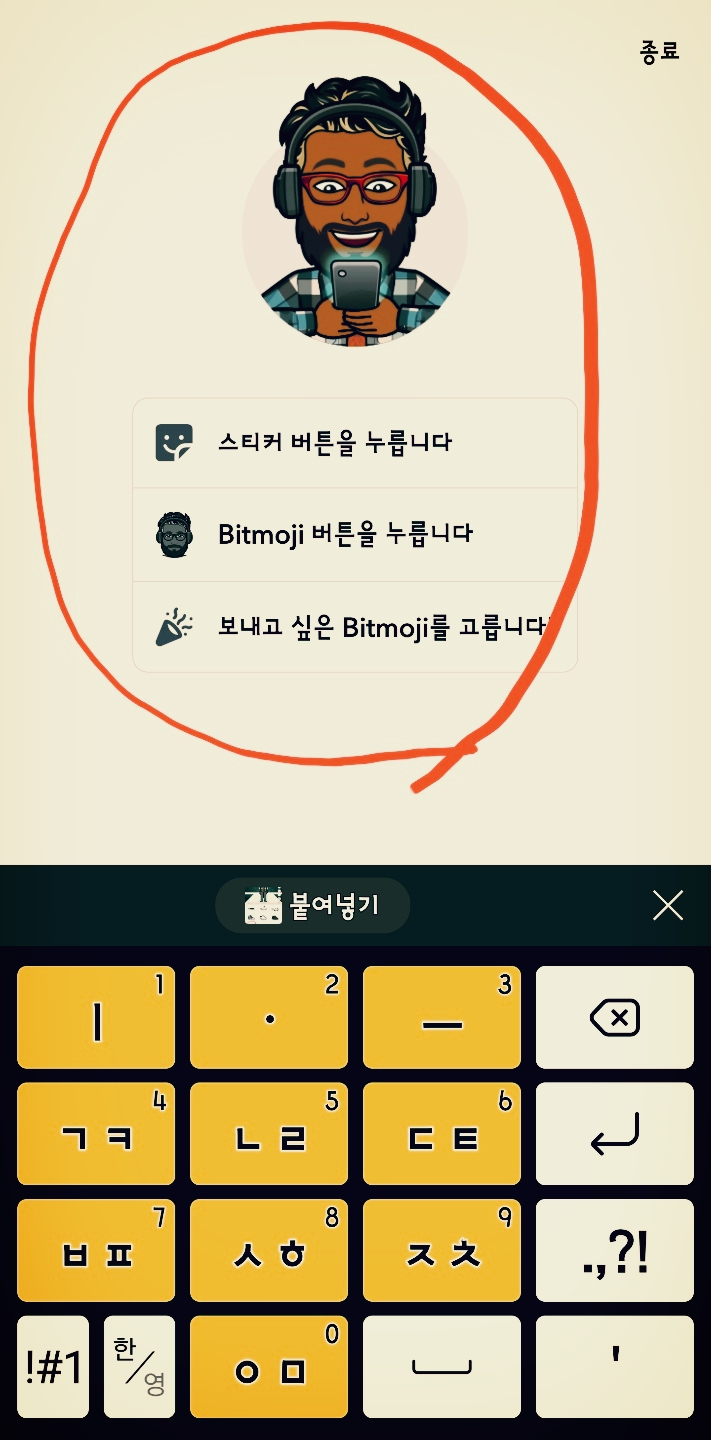 참, 이렇게 탄생한 아바타를 쓰려면 다음과 같이 하면 됩니다. 모바일 키보드에서 스티커 버튼을 누르고, 비트모지 버튼을 선택해서 사용하면 끝.