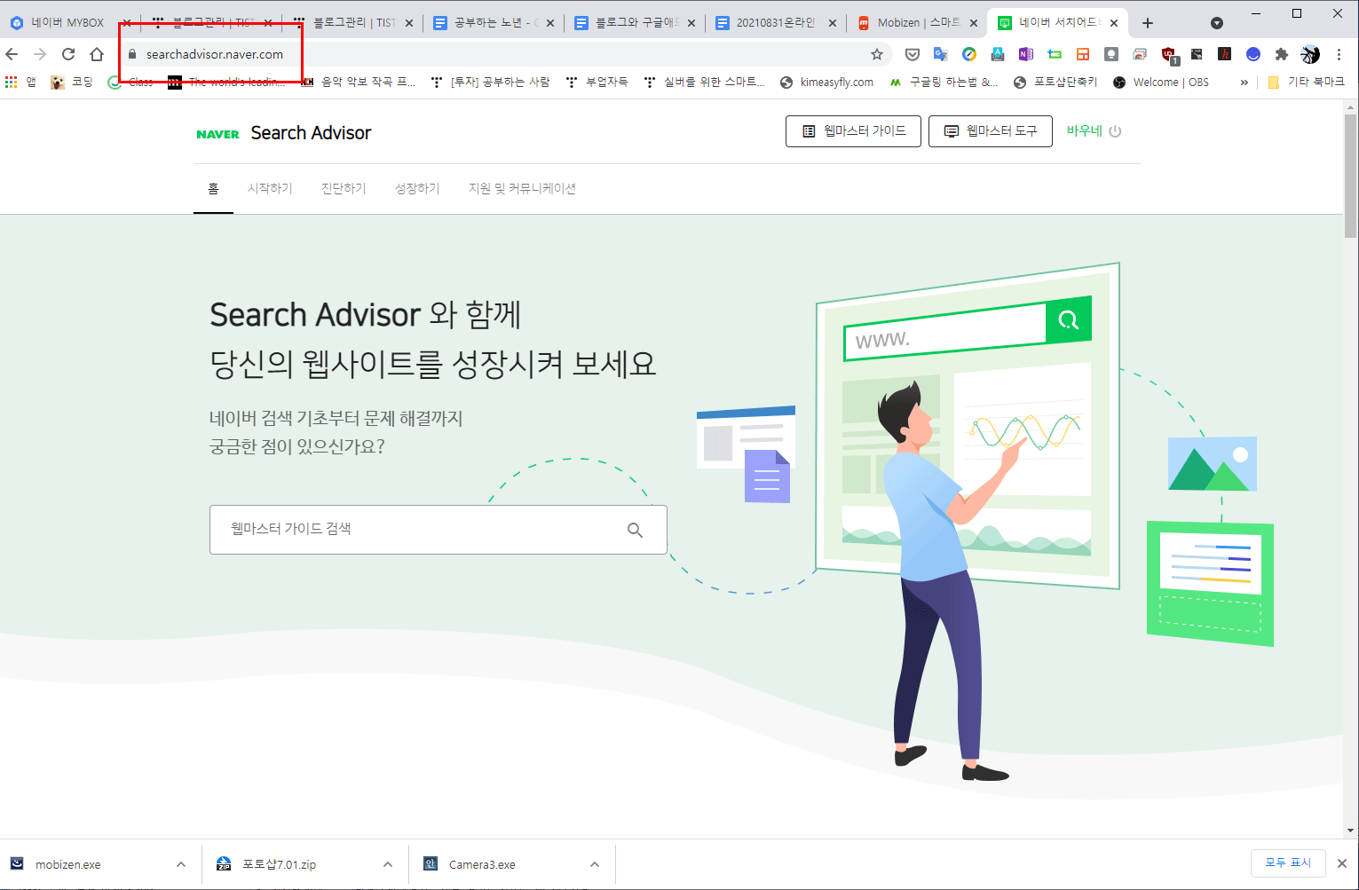 네이버 등 검색포털에 내 블로그의 포스팅이 검색노출되게 하려면 각 검색포털 웹마스터도구에 내 티스토리 블로그를 등록해야 합니다. 네이버의 경우는 [searchadvisor.naver.com]입니다. 네이버에 가입된 사람은 로그인을 바로 할 수 있습니다.