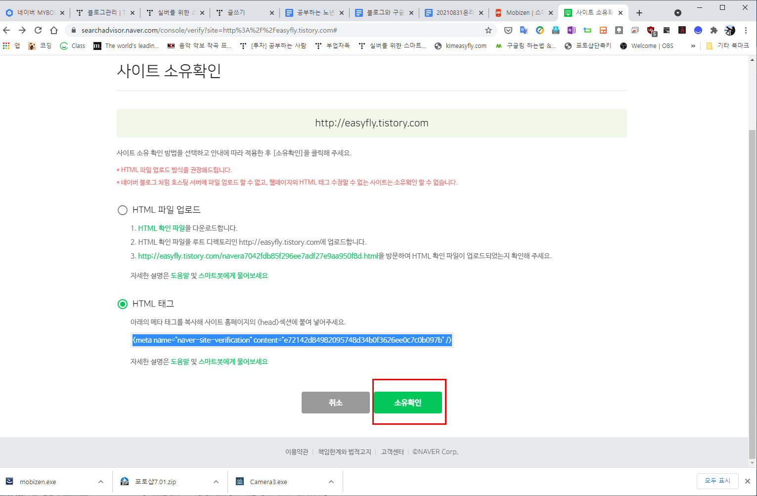 사이트 소유확인 과정은 아까 열어진 상태로 있기 때문에 브라우저 탭만 변경하여 찾아 들어오면 됩니다. 그리고 아래에 있는 버튼 [소유확인]을 클릭하면 끝.