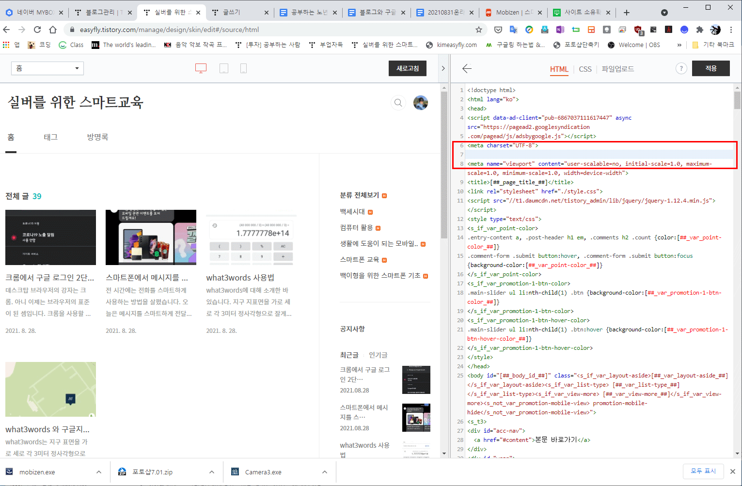 자신의 티스토리 블로그 관리 화면에서 꾸미기 메뉴에 있는 스킨편집을 클릭한 후 'HTML편집'을 클릭합니다. 편집할 수 있는 HTML이 나옵니다. 여기서 meta로 시작하는 태그를 골라 그 사이에 앞서 복사한 태그를 붙여 넣습니다.
