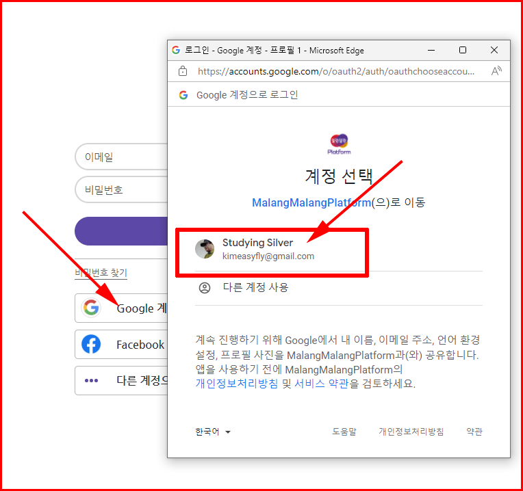 주의할 것이 있습니다. 구글계정으로 회원가입을 한 경우에는 나중에 말랑말랑을 사용하는 경우 '구글'을 선택해서 진행해야 합니다. 'Google 계정으로 로그인'을 선택하면 다음과 같은 확인 과정이 진행됩니다.