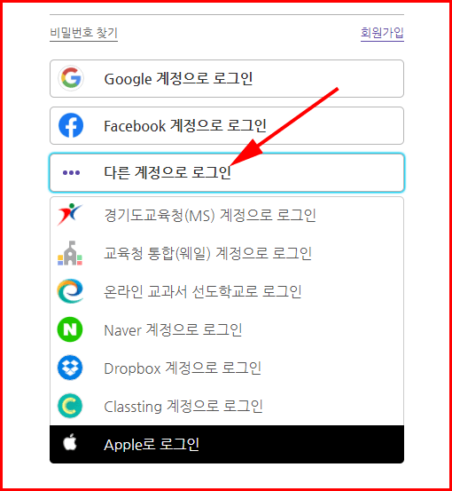 다른 계정 사용을 선택하면 아래와 같은 여러 사이트를 보여줍니다. 국민포털 '네이버'를 선택해서 로그인을 하셔도 좋을 것입니다. 아이폰 사용자라면 애플로 로그인하시면 됩니다.