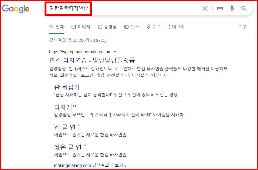'말랑타자연습' 또는 '말랑말랑타자연습'으로 검색합니다. 검색 결과로 바로 '말랑말랑플랫폼'이 검색됩니다. 여기서 사이트에 들어가면 타자연습을 게임처럼 즐길 수 있습니다. 게임을 즐기는데 타자 실력도 늘어난다. 좋은 일 아니겠어요.