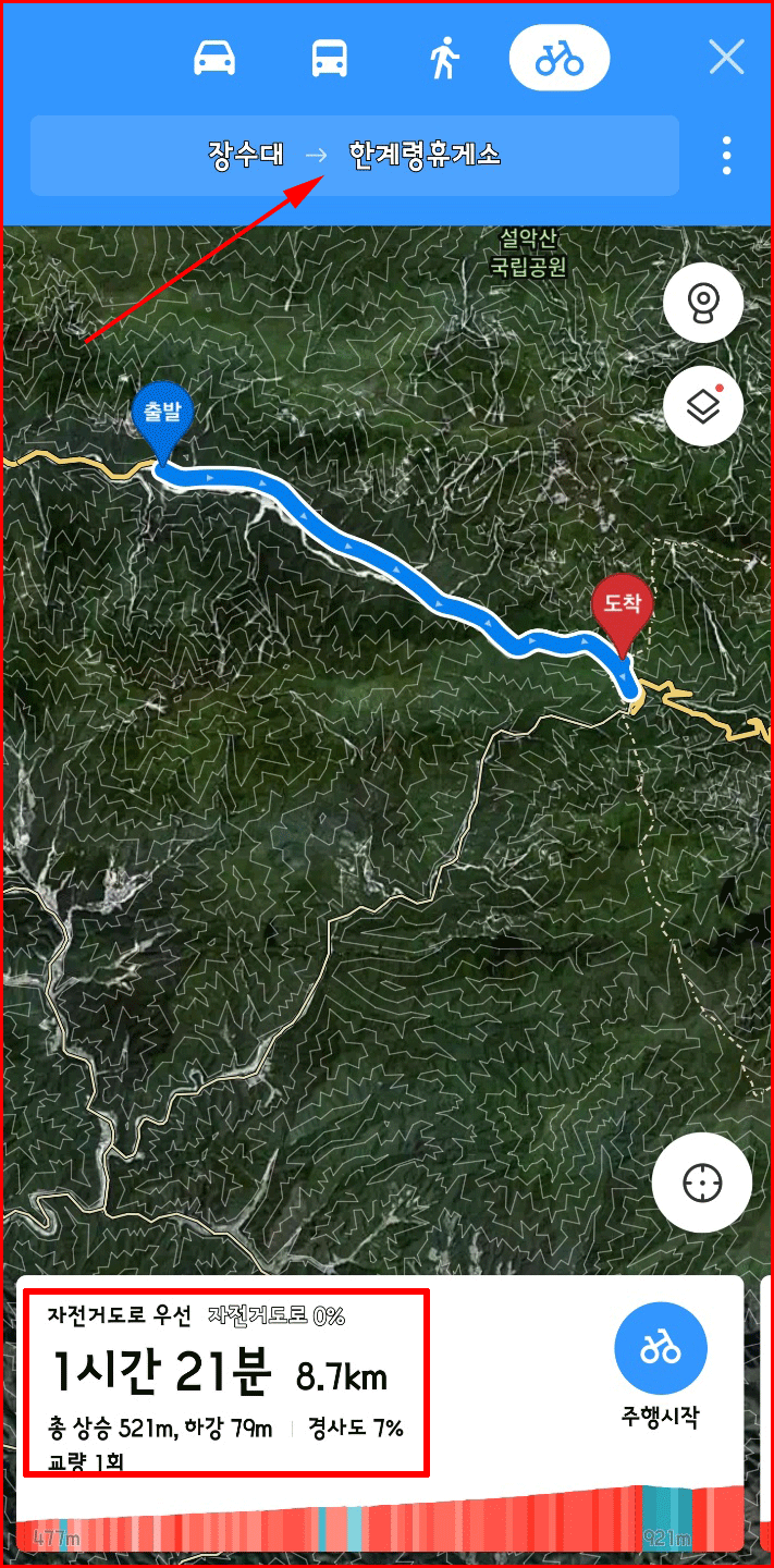 장수대에서 한계령휴게소까지 자전거길을 검색했네. 그 결과는 다음과 같네. 8.7km의 짧은 거리이지만 업힐이 계속되는구먼. 총 상승 고도는 521m, 하강은 79m이고 전체의 경사도 7%로 계산됐네. 아까도 지적했듯이 7%는 평균 개념이니까 구체적인 자전거 주행 길은 훨씬 험한 비탈길도 있을 법하네. 이 길의 최고 해발 고도는 921m이고 장수대 근처의 가장 낮은 고도는 477m일세.