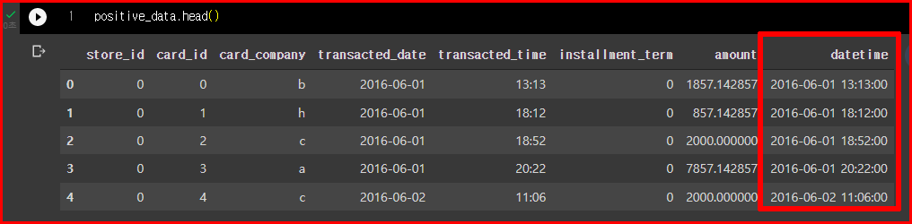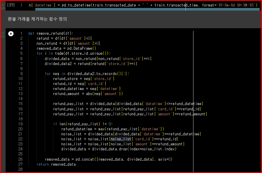 - 거래일과 거래시간을 합친 datetime 변수를 만들고 환불 거래를 제거하는 함수를 정의하는 코드를 작성합니다.