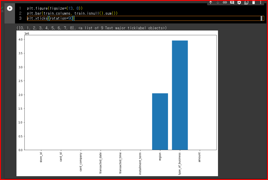 확인 결과 지역(region)과 업종(type_of_business) 속성에 결측치가 존재합니다. 데이터에서 상점의 '지역과 업종'은 절반 이상이 결측치였습니다. 범주형 속성이고 대치할 방법도 없어 열 전체를 제거하고 데이터 처리를 진행합니다.