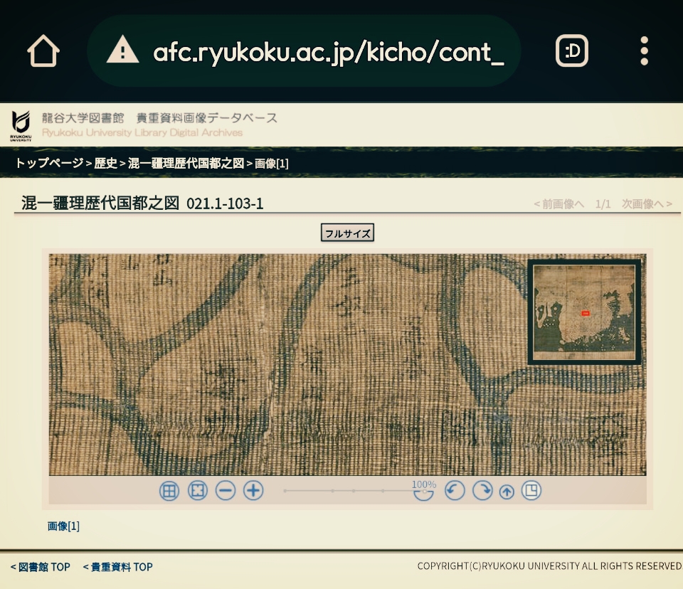 원본은 전해지지 않고 판본이 몇 있습니다. 그 판본도 우리나라에는 없고 일본에 있지요. 그중 하나가 교토의 류코쿠 대학 판본입니다. 류코쿠 대학에서는 강리도를 디지털로 복원하여 자신의 대학 홈페이지에 공개했습니다. 물론 파일은 공개하지 않고 부분을 확대해서 지도 내용을 확인할 수 있도록.