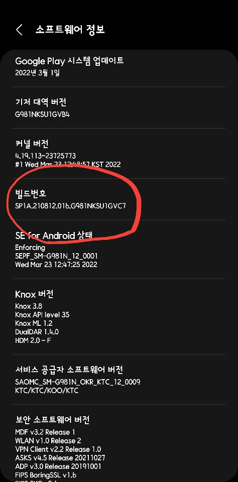 USB디버깅을 선택하기 위해 필요한 메뉴가 '개발자 옵션'. 그걸 위해 '소프트웨어정보>빌드번호'를 7회 반복 클릭.