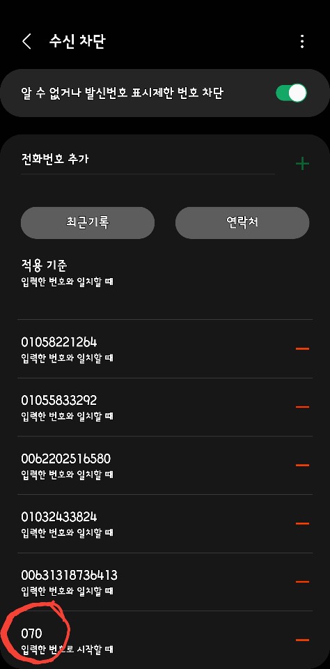 다음은 '070'에서 온 전화는 사그리 차단된다는 의미입니다. 오른편 '-'는 해제 표식입니다. '해제'시키면 원상 북구 됩니다.