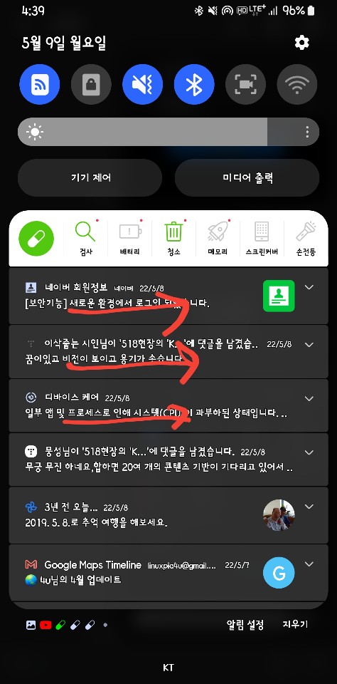 확인 후 손가락을 오른쪽으로 쓰윽~하면 사라집니다. 화면 정소도 자연 쓰윽~