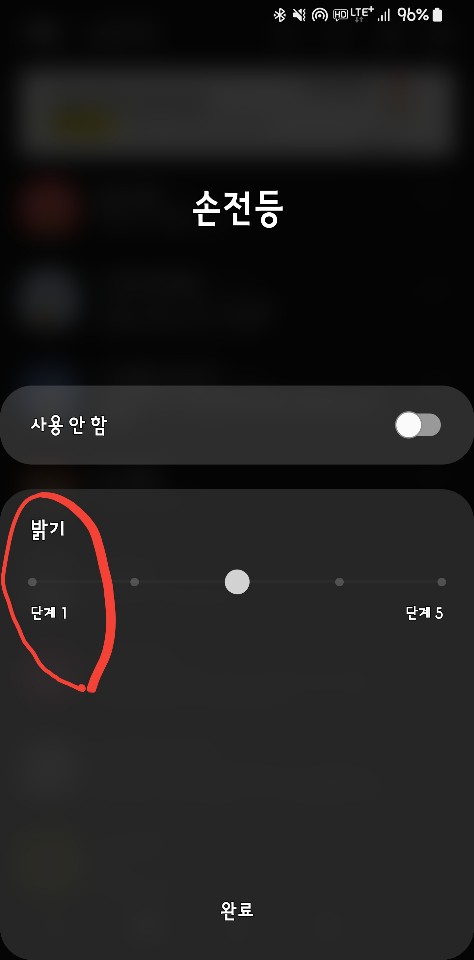 손전등을 사용하는 경우가 가끔 있습니다. 그 밝기를 조절하는 방법입니다. 퀵패널에서 '손전등'을 길게 누릅니다. 밝기 정도 설정 창에서 조절하면 끝.