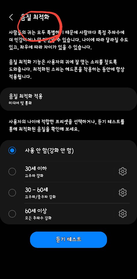 사람마다 귀가 다릅니다. 특히 나이 들어감에 따라 듣는 주파수대가 달라집니다. 해서, '듣기에 맞는 주파수대'를 조절해주는 메뉴입니다. 나이들면 모든 주파수대를 가화하는 쪽이 좋을 듯.